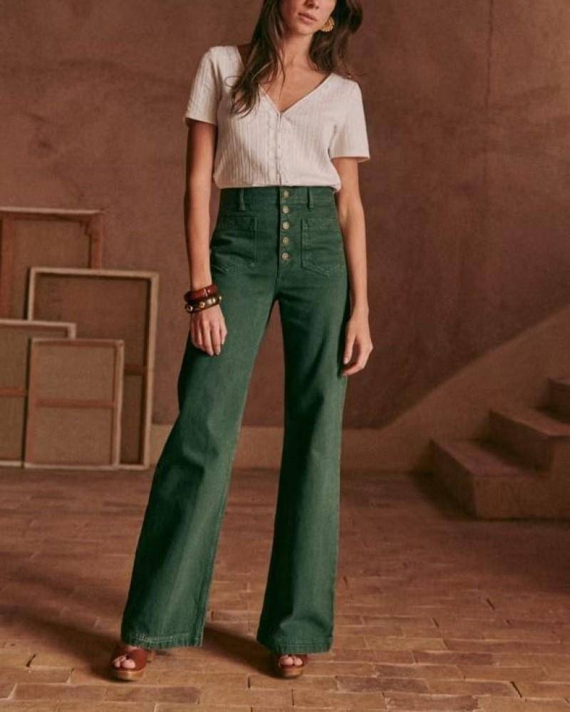 Pilih atasan cream terang agar warna celananya bisa menjadi statement.