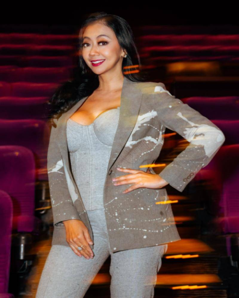 Asri Welas terlihat menawan dengan setelan bustier dan legging berwarna abu-abu muda dan blazer berwarna senada. Ia terlihat profesional saat mengisi acara bersama WWF.