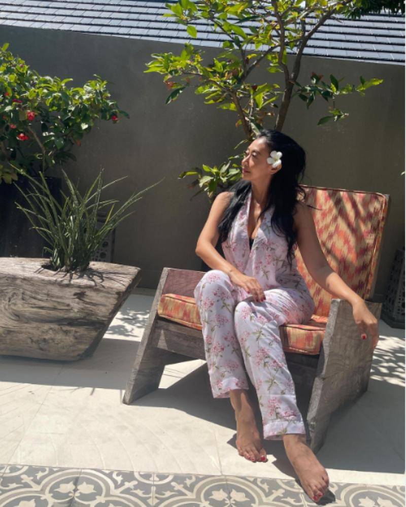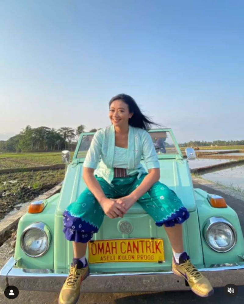 Terlihat ia mengenakan onesie dengan warna dan motif terang. Ia menggerai rambutnya dan menyematkan bunga di salah satu telinganya. Terasa sekali summer look-nya!