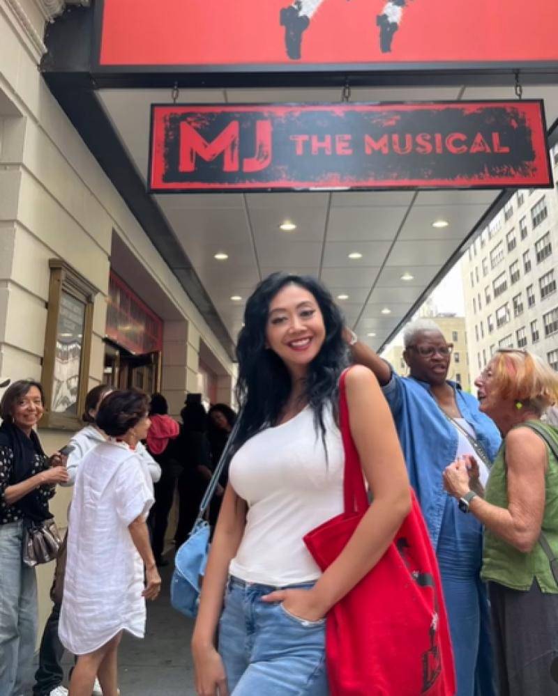 Saat jalan-jalan ke AS, ia menjelajahi banyak tempat dengan pakaian yang kasual. Asri terlihat mengenakan tanktop putih dan jeans denim berwarna biru terang.