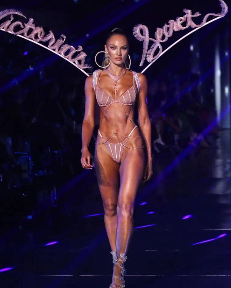 Tahun ini candice kembali ke panggung VS dengan penampilan yang mengagumkan. Dengan usianya yang memasuki kepala 3, ia masih terlihat begitu memesona. Candice pun menunjukkan bra set berwarna nude pink, dengan pola garis-garis berwarna perak yang mengesankan.
