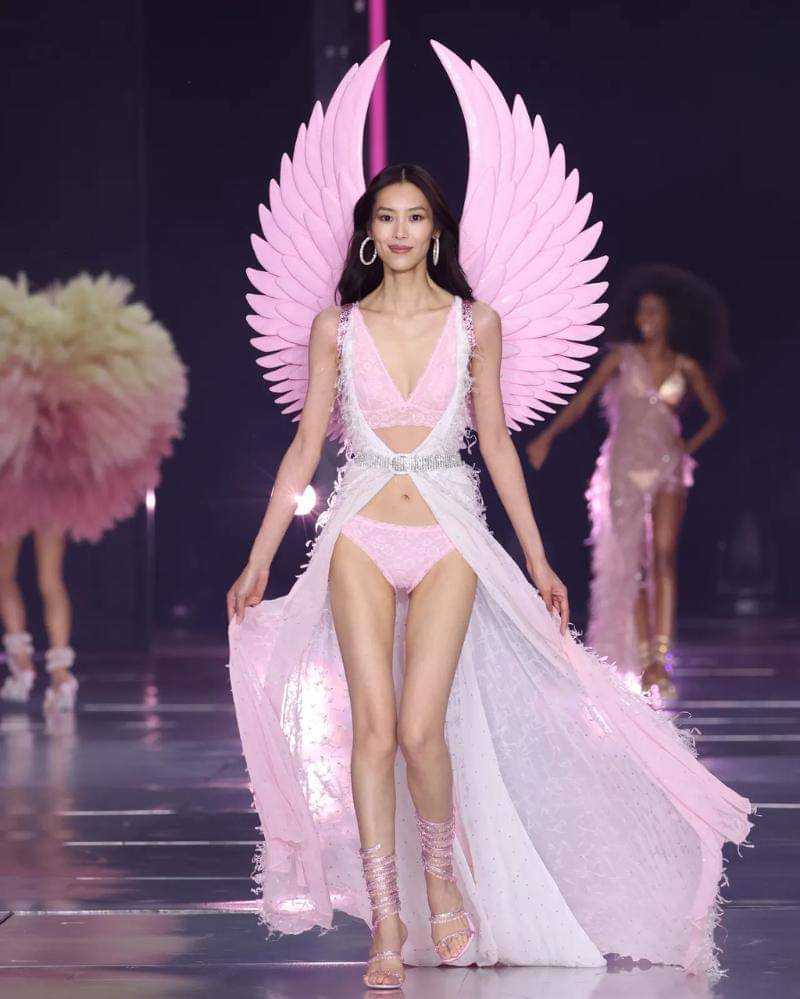 Kali ini, ia hadir untuk membawakan busana-busana terbaik dari VS. Ia terlihat mengenakan dua karya busana yang begitu mengagumkan. Salah satunya adalah bra dengan bahan lace, bergaya one shoulder, berwarna soft pink yang sangat cantik.