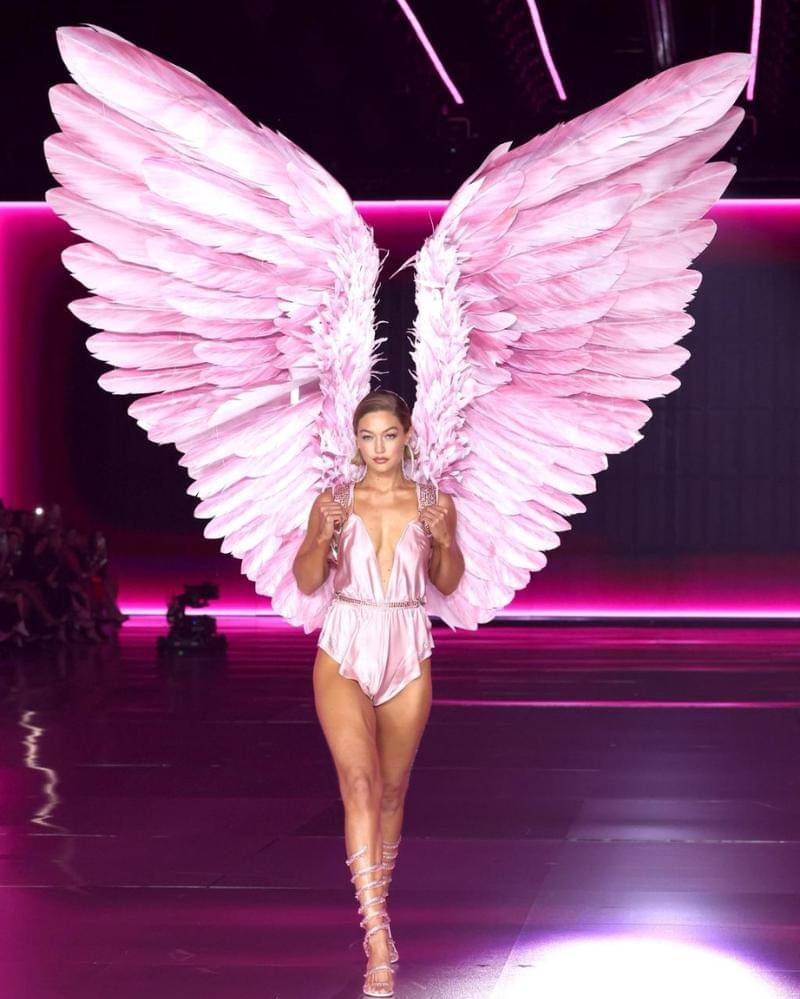 Gigi menjadi pembuka peragaan busana kali ini. Ia pun berjalan dengan percaya diri dan penuh gaya, dengan lingerie berwarna pink yang menggemaskan. Dipadukan dengan ikat pinggang yang berkilau.