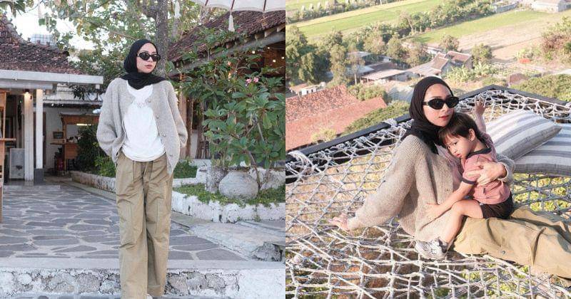 Dirinya juga menggunakan celana kargo berwarna khaki, pashmina hitam, dan juga kacamata berwarna senada. Keren ya, Ma penampilannya!