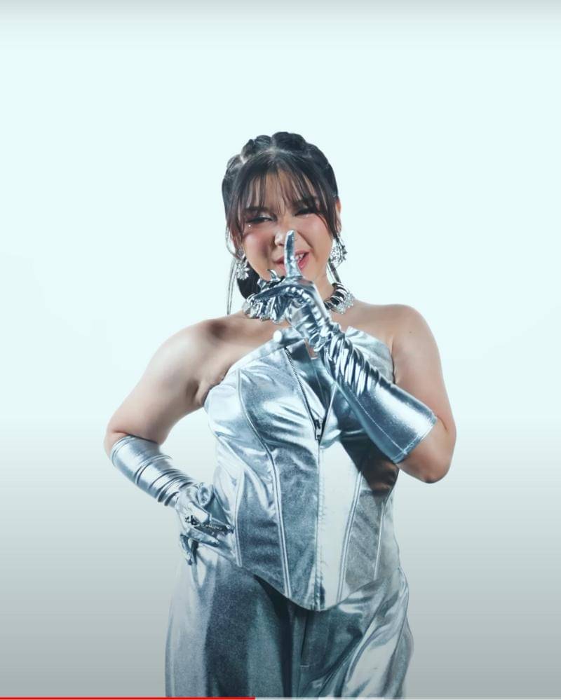 Selain menonjolkan budaya Jawa, Tiara Andiri turut menggunakan outfit modern ala idol K-Pop zaman sekarang, lho! Ia menggunakan atasan dan bawahan yang serasi. Terdiri dari tube top dan celana longgar high waisted berwarna silver metallic.
