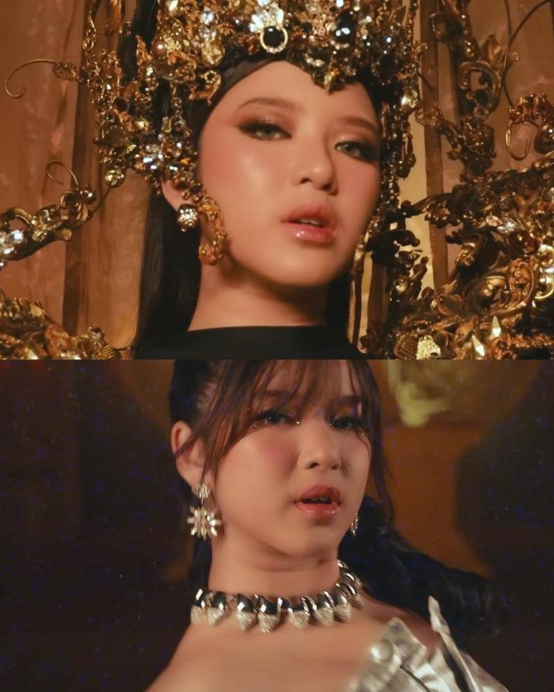 Sedangkan, look kedua menampilkan makeup glam. Complexion terlihat menggunakan base makeup yang cukup tebal, namun tidak berlebihan. Diikuti dengan warna cokelat dan silver sebagai warna pada kelopak mata, pipi dengan warna pink yang segar, serta warna nude pink dengan hasil akhir glossy, yang sama seperti pada look pertama.
