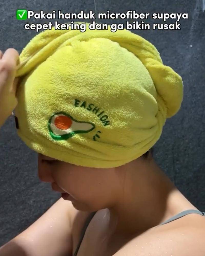Selain itu, ingat untuk perlakukan rambutmu dengan lembut. Hindari menggosoknya dengan kasar saat mengeringkan, karena bisa membuat kutikula rambut terbuka dan rambut menjadi rapuh.