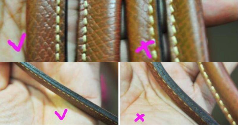 Ciri utama pegangan tas asli adalah warna tepi pegangan, yang selalu hitam atau cokelat tua, tidak pernah cokelat muda atau warna lainnya.