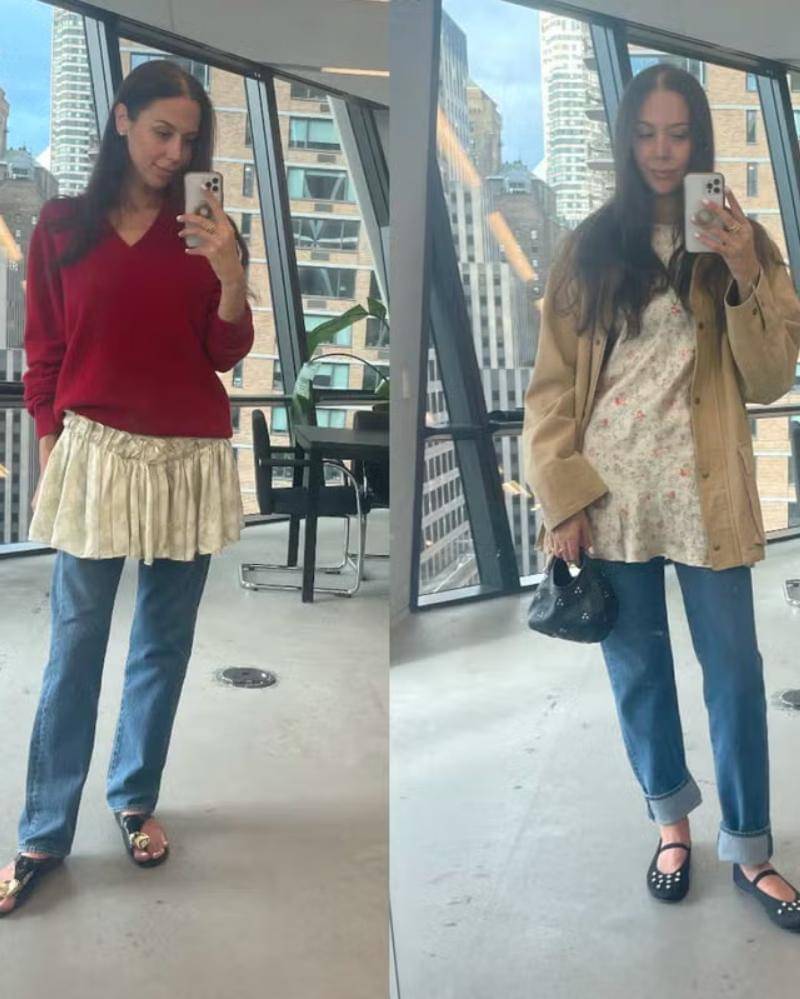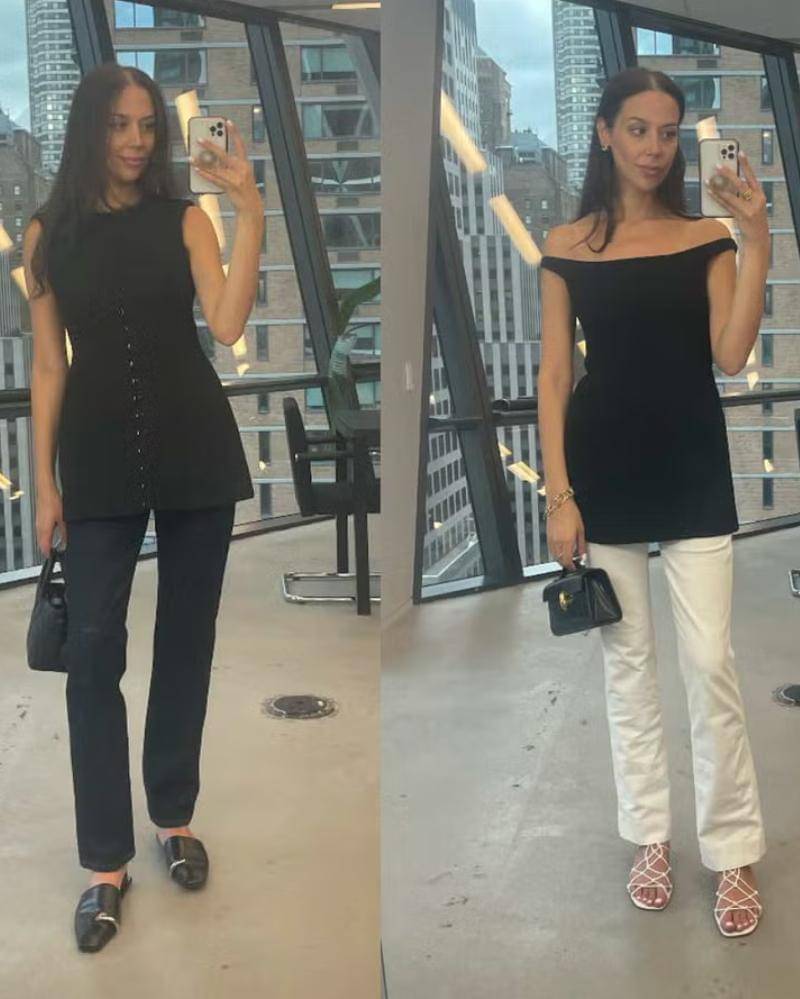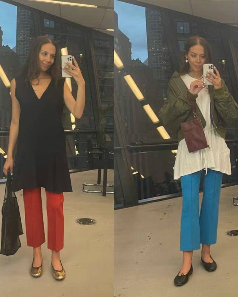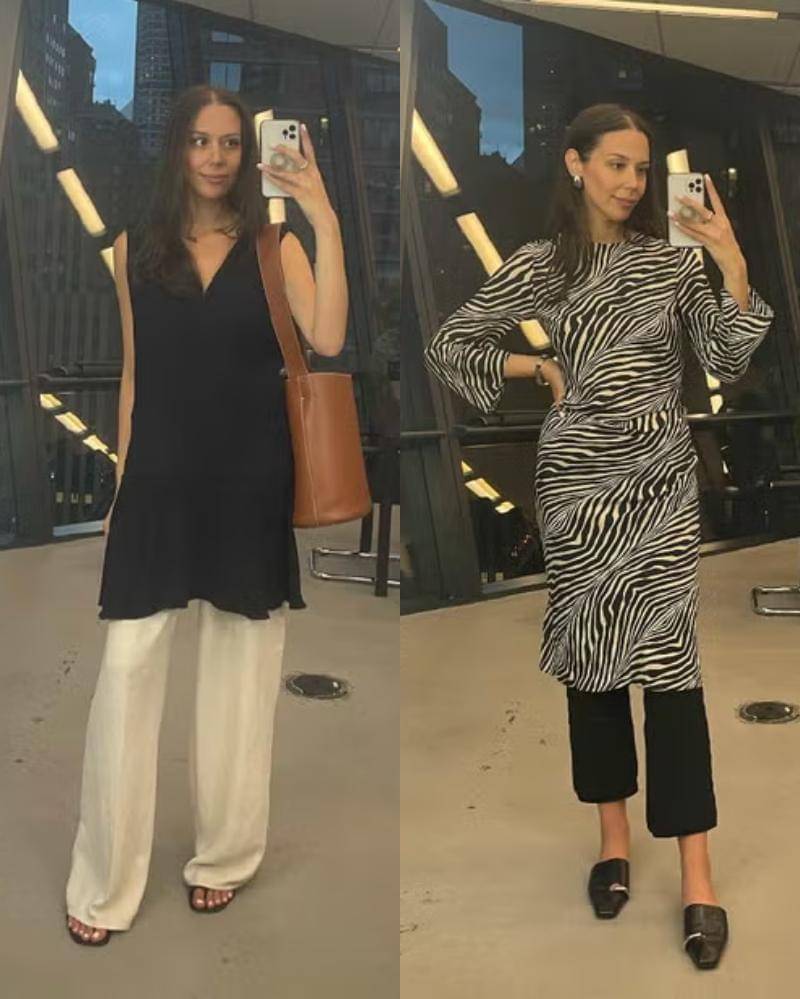 Untuk menciptakan gaya yang lebih bersahaja, bereksperimenlah dengan proporsi. Mama bisa mengenakan mini dress biru tua atau hitam yang flowy dengan celana panjang krem ​​berkaki lebar dan tas selempang besar untuk tampilan yang longgar.