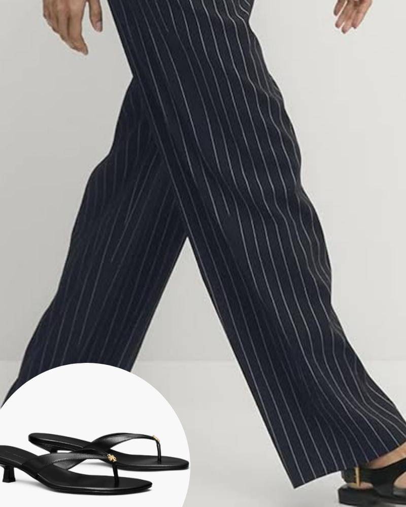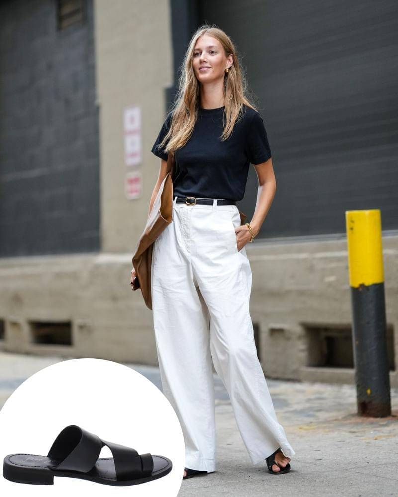 Siluet sandal seperti itu ditunjukkan bahkan oleh label kelas atas seperti Ferragamo dan Alaïa, hingga merek yang lebih mudah diakses seperti Zara dan Massimo Dutti. Kamu juga bisa memadukan sandal jepit ini dengan busana santai, yang terdiri dari celana panjang putih berpinggang tinggi, ikat pinggang ramping, dan kaus hitam yang elegan.