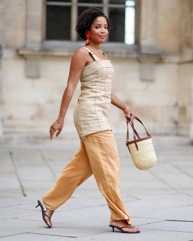 Kamu bisa memadukan sandal ini dengan pakaian bernada krem dan cokelat, berbahan serba linen, yang cocok untuk berjalan-jalan disekitar kota.