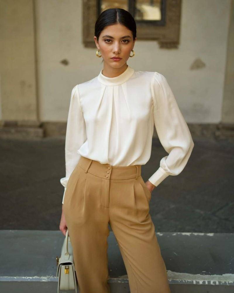 Untuk penampilan yang formal, Mama bisa memilih atasan berwarna putih. Cokelat dan putih adalah paduan cantik dan netral untuk acara yang cukup resmi.