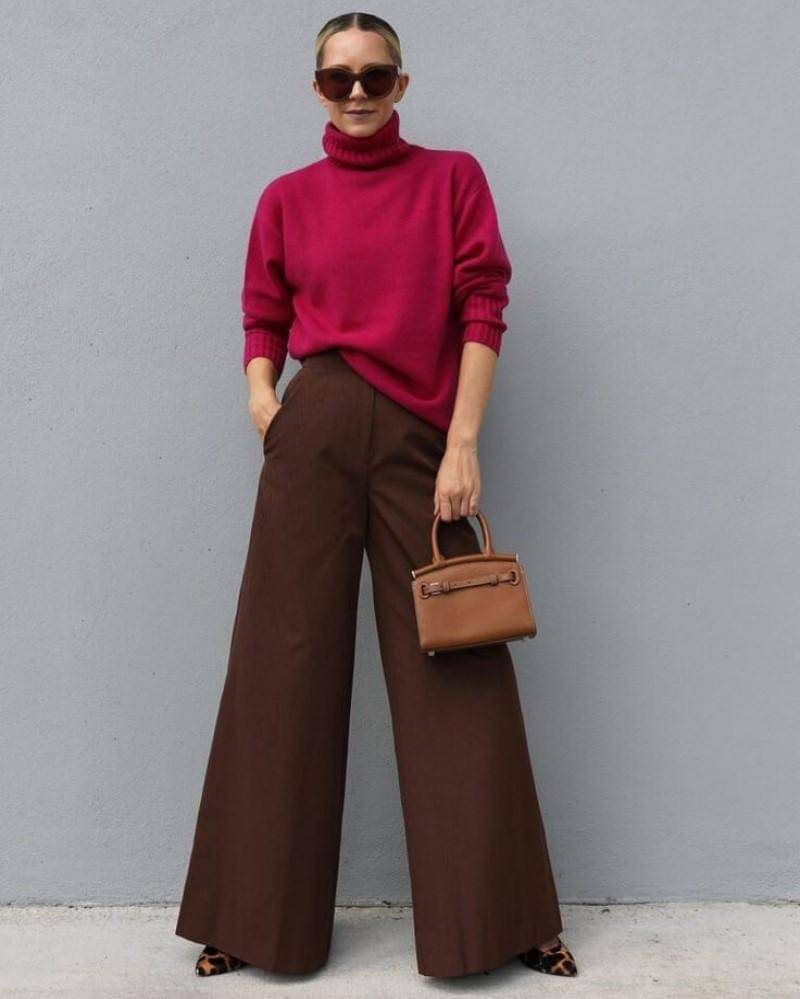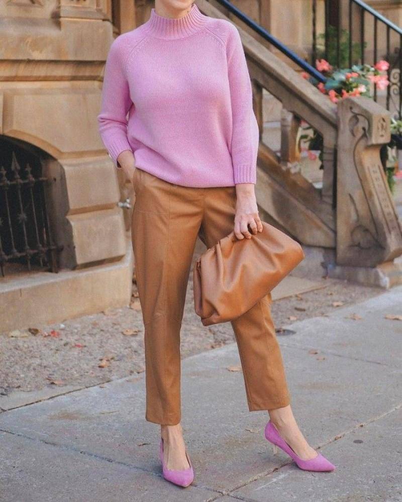 Mama bisa memadukan baju warna pink dan heels berwarna yang sama. Sedangkan celana cokelat dipadukan dengan clutch atau handbag berwarna senada.