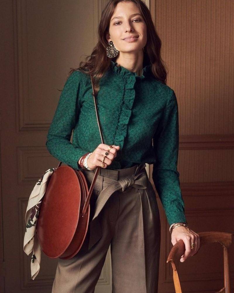 Pilih atasan dengan warna hijau emerald dan bawahan cokelat dengan warna yang agak gelap. Tambahkan anting dan tas yang bisa menjadi statement.