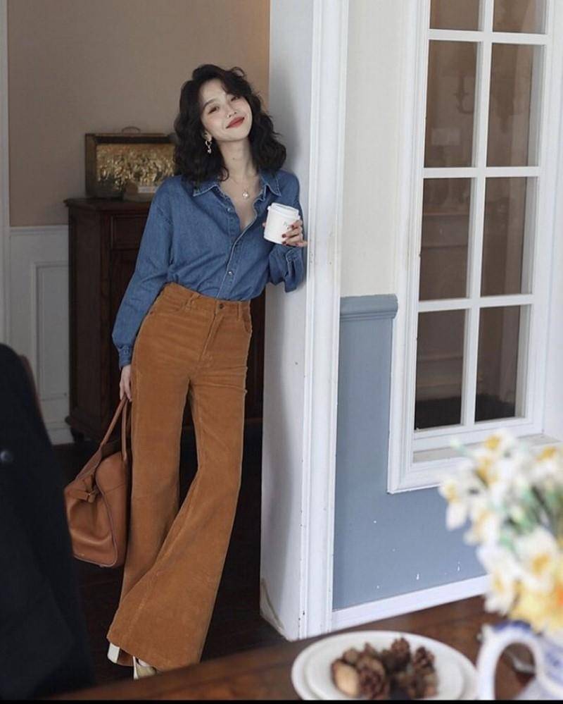 Sekali-kali, ganti bawahan denim menjadi atasan denim. Untuk warna yang lebih cerah, Mama bisa memadankan atasan denim dengan bawahan celana cokelat.