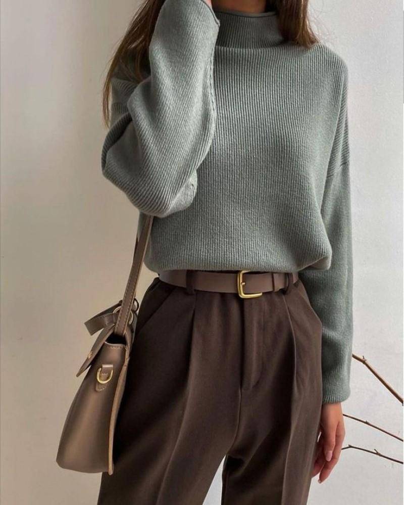 Mama bisa memilih bell trousers dengan atasan sweater turtleneck seperti ini. Untuk statementnya, jangan lupa sematkan handbag berwarna senada dengan celana.