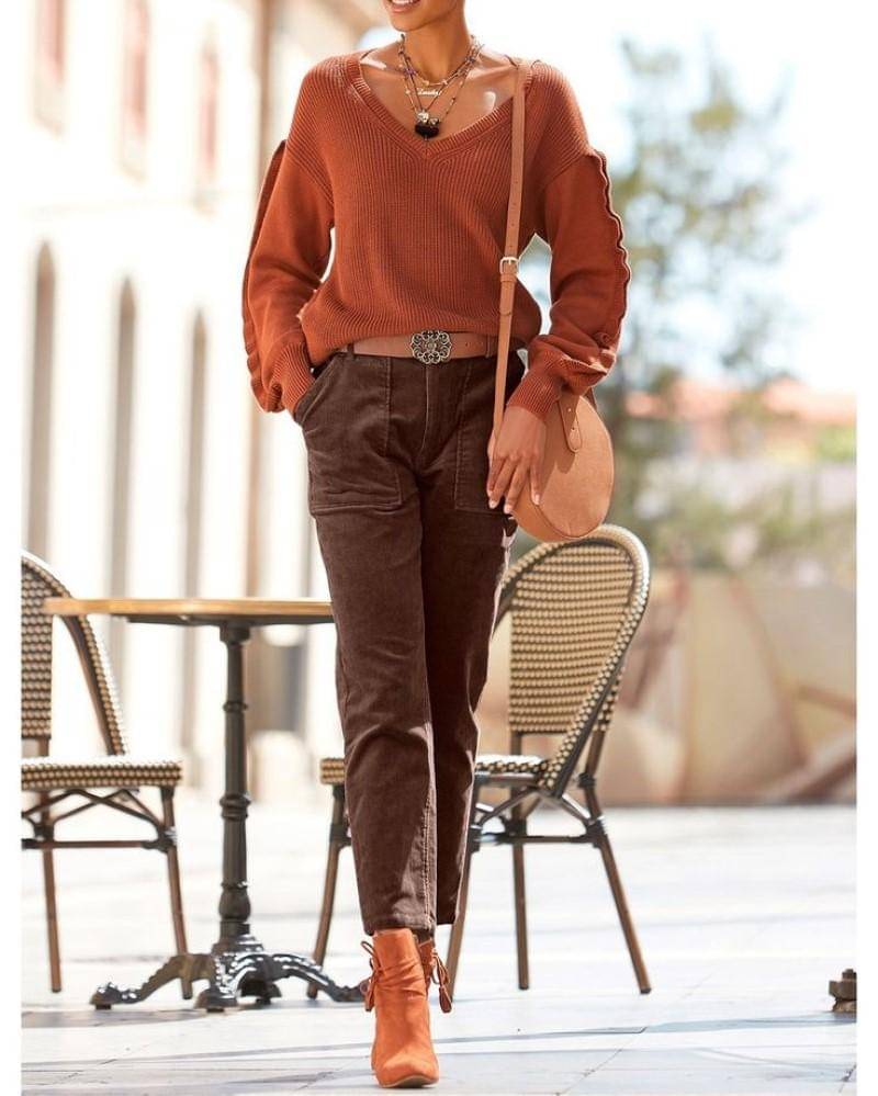 Masih dari warna turunan cokelat, ada baju orange tua yang cocok juga untuk dipadankan dengan celana cokelat.
