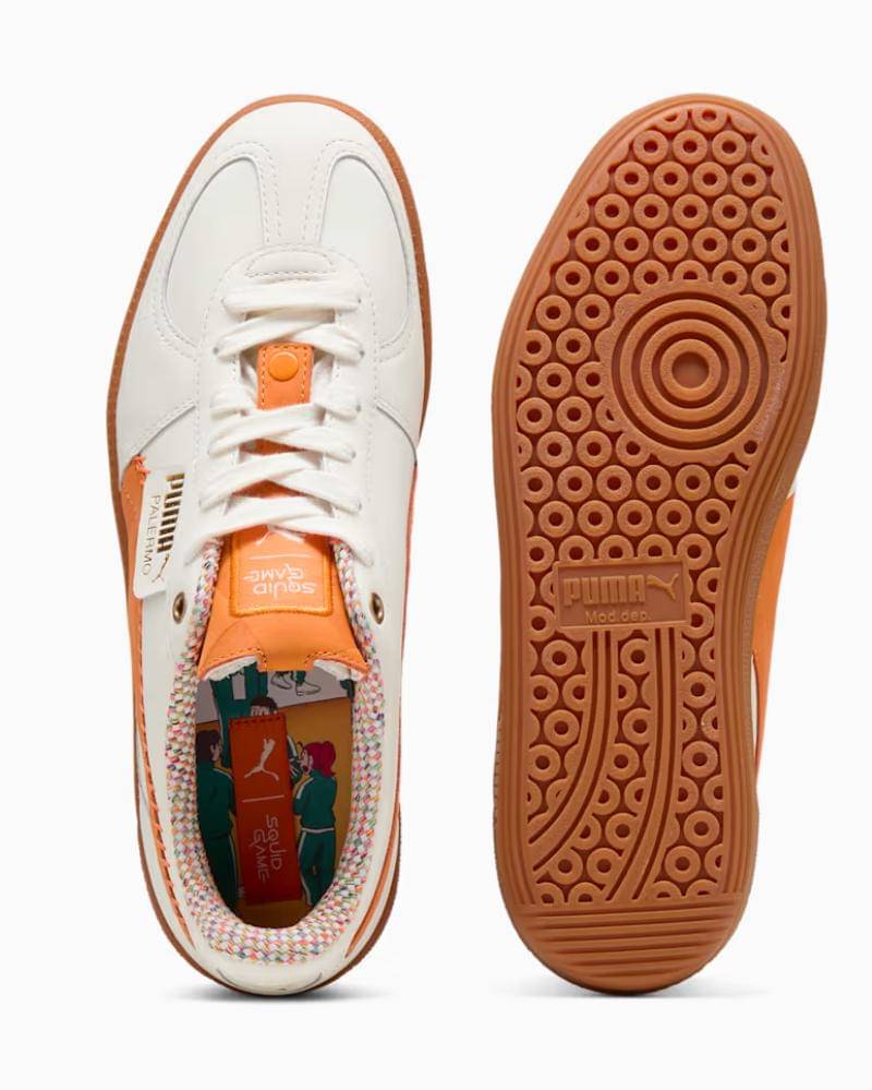 Pilihan sepatu lainnya yang merupakan hasil kolaborasi PUMA dengan Squid Game, dapat kamu lihat pada model Palermo. Paduan warna jingga dan putih, dengan pinggiran insole unik, dan gambar para pemain serta penjaga pada dalam sepatu, dan juga di salah satu sisi sepatu, menunjukkan detail yang nggak main-main.