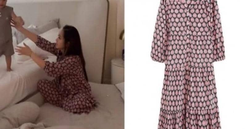 Nagita mengenakan midi dress dengan lengan panjang. Dress bermotif ini diketahui keluaran dari Oysho, sebuah fashion brand asal Spanyol.