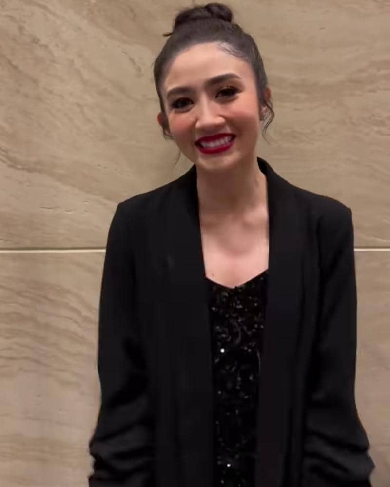 Dengan paduan gaun sequin yang mewah dan blazer hitam yang elegan, sneakers memberi sentuhan segar dan modern, menjadikan tampilan Febby terlihat santai namun tetap memikat.