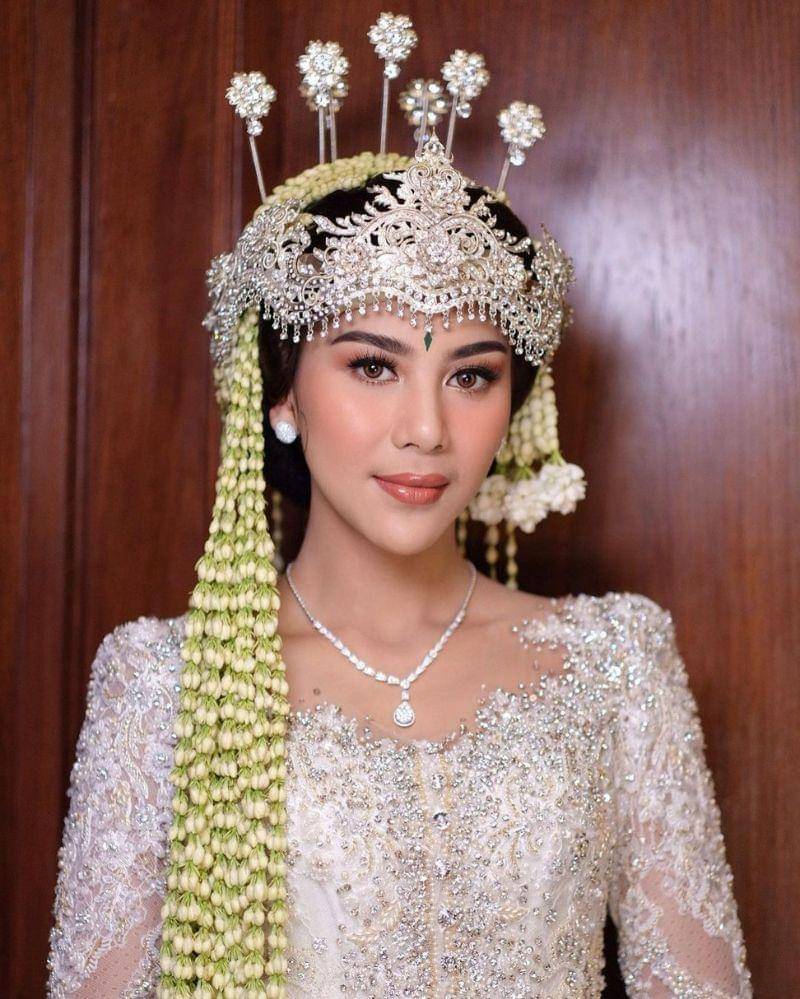 Rambutnya disanggul rapi dan dihias dengan mahkota pengantin khas Sunda atau yang biasa dikenal dengan siger. Ronce melati segar tampak menutupi bagian sanggul belakang, juga terlihat menjuntai di bahu kanannya.