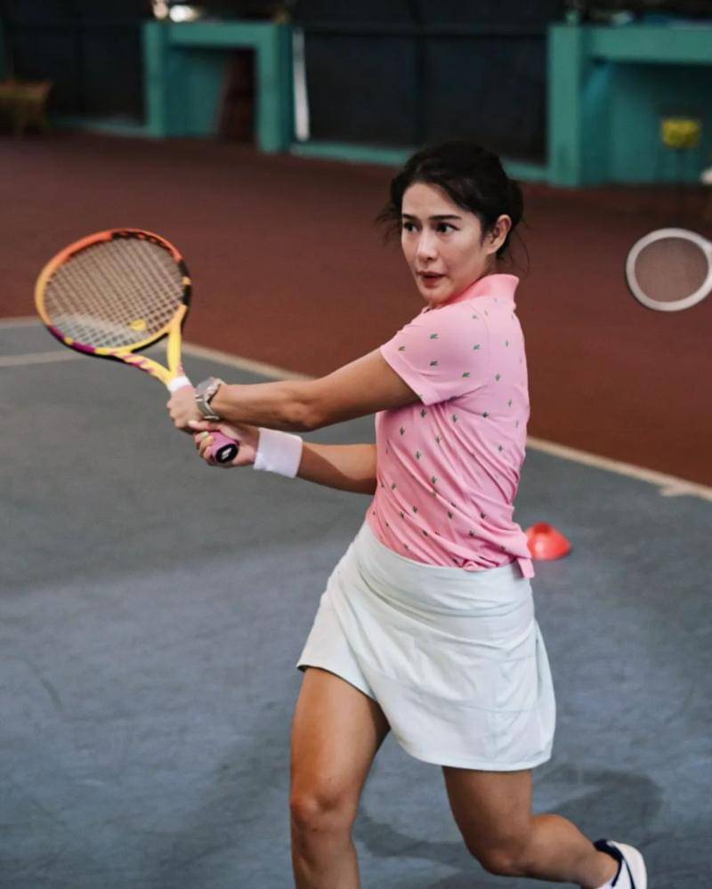 Tenis menjadi saat untuk Dian refreshing sekaligus menyehatkan tubuh. Di foto yang satu ini, Dian terlihat menunjukkan kemampuan bermain tenis, dalam balutan baju olahraga yang lengkap. Ia memakai atasan kaus berkerah, berwarna pink, dipadukan dengan rok berwarna putih.