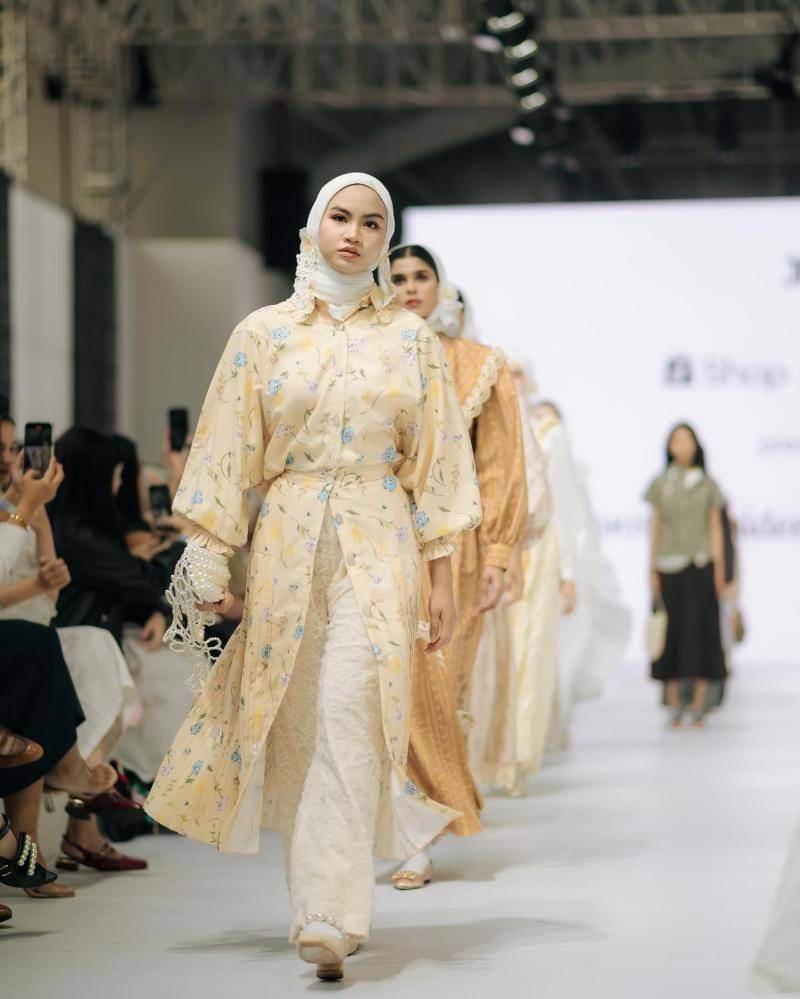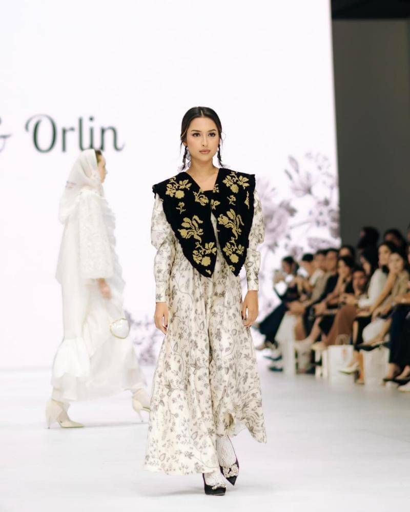 Paduan kerudung putih memberikan sentuhan elegan, sementara celana panjangnya menambah kesan modern dan chic. Stiletto heels putihnya semakin mempertegas tampilan yang anggun, menjadikan Xaviera tampil menawan di runway.