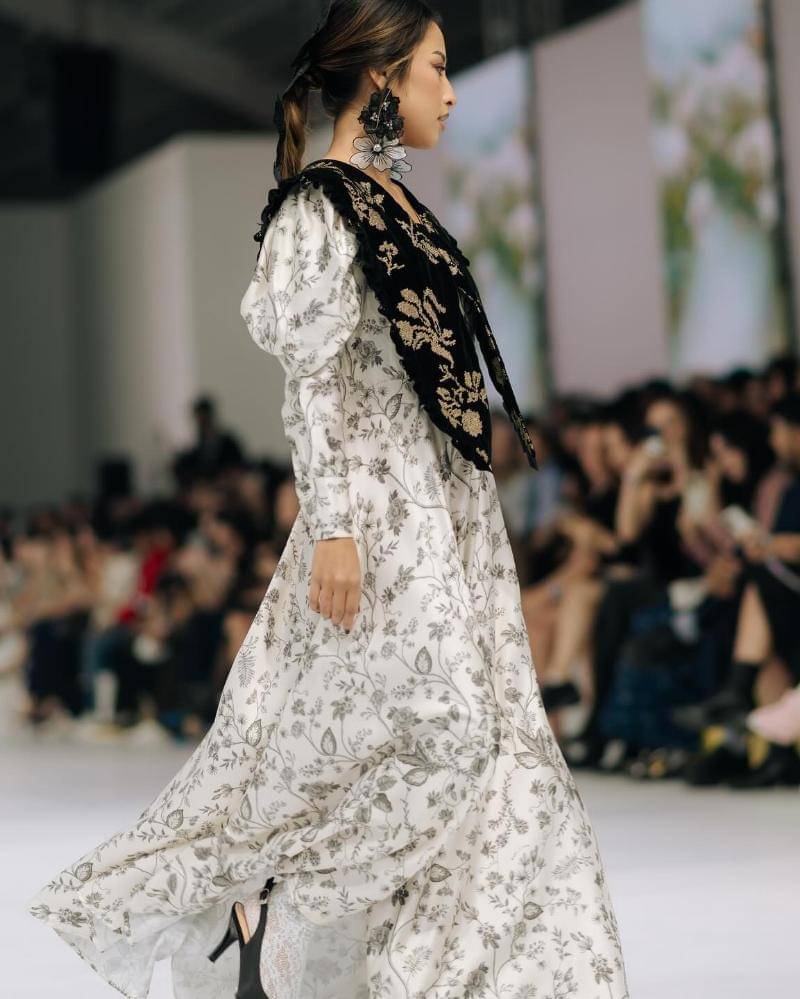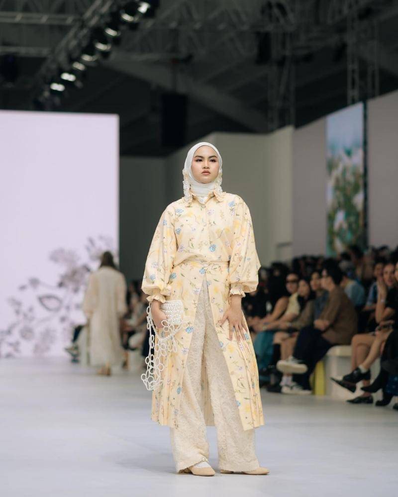 Dengan detail motif bunga yang indah, Xaviera berhasil menarik perhatian banyak orang, menciptakan look yang cerah dan berwarna. Penampilan ini menunjukkan kepribadiannya yang ceria dan menambah warna pada suasana fashion show.