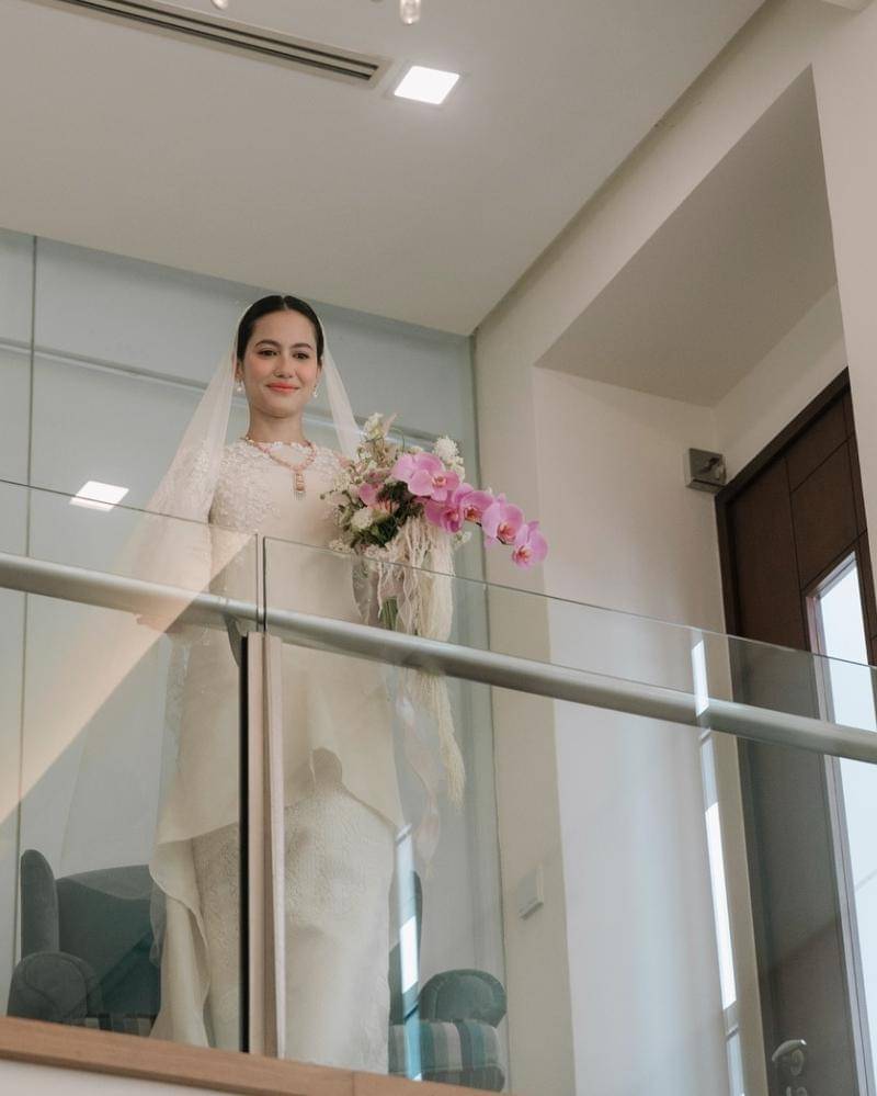Busana pernikahannya semakin menawan dengan tambahan peplum yang memiliki ekor panjang, memberikan aksen modern yang memikat.