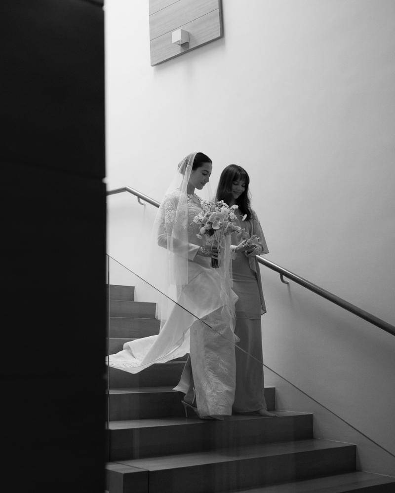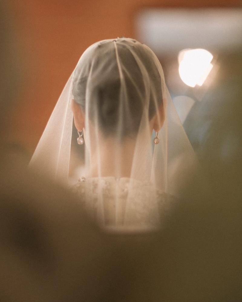 Kombinasi antara sleek low bun dan tulle veil membuatnya tampil menawan, menambah pesona dalam momen bahagia tersebut.