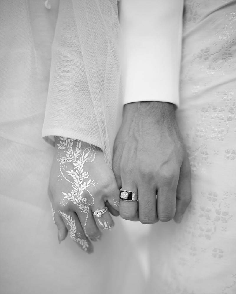 Detail henna putih ini tidak hanya berfungsi sebagai aksesoris, tetapi juga melambangkan kebahagiaan dan harapan di momen yang penuh makna.