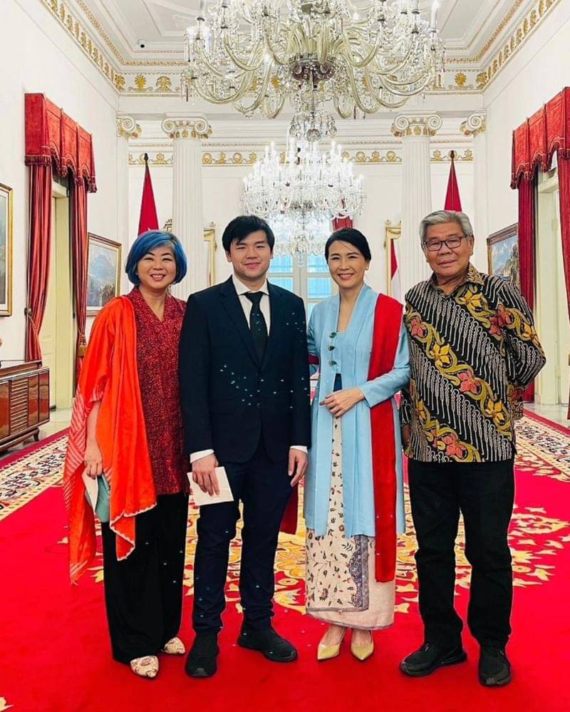 Ia juga menambahkan bros cantik di bagian depan kebaya, memberikan sentuhan detail yang elegan. Untuk melengkapi busananya, Veronica mengenakan obi berwarna biru yang serasi serta bawahan kain batik berwarna putih, menciptakan kesan yang harmonis.