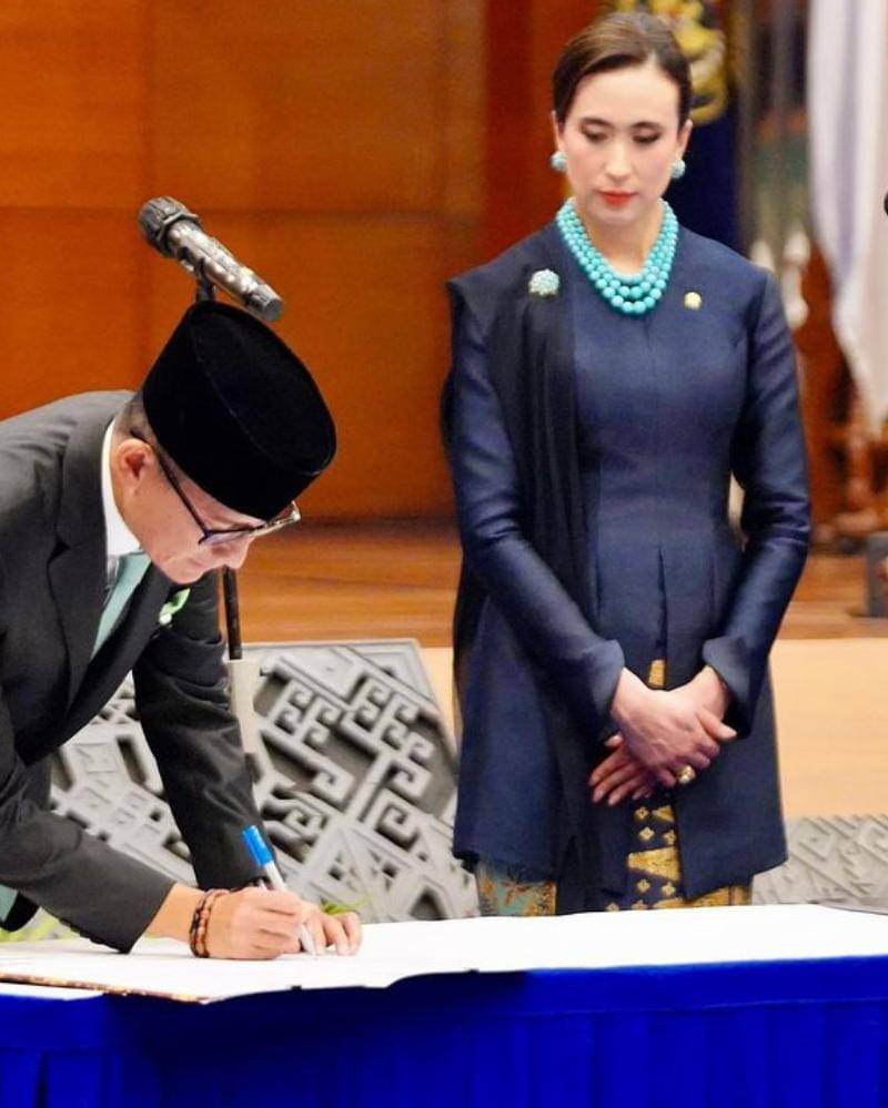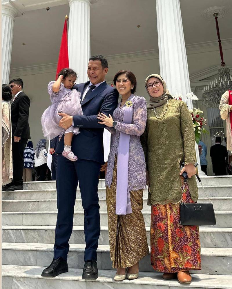Penampilan Diana semakin sempurna dengan kalung yang melengkapi busananya, memberikan kesan yang anggun dan berkelas. Kebaya navy yang dikenakannya tidak hanya mencerminkan keindahan, tetapi juga menunjukkan profesionalisme dalam posisinya yang baru.