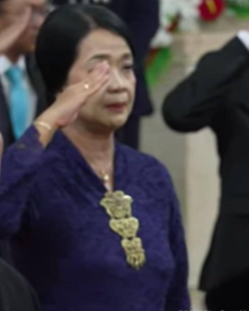 Kebaya tersebut dipadukan dengan selendang kain cokelat yang menghiasi bahunya, serta bros emas yang menambah sentuhan glamour pada penampilannya.