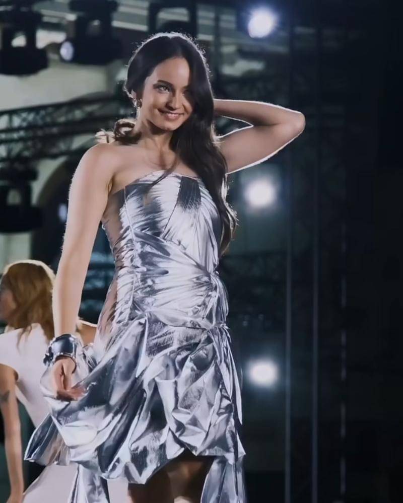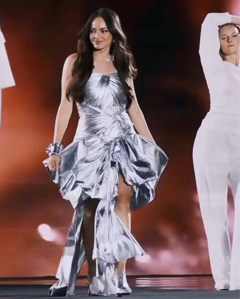 Enzy Storia berjalan dengan penuh percaya diri di acara L'Oreal Paris LE DEFILE 2024 Paris Fashion Week. Ia mengenakan busana berupa dress panjang berwarna metalik, dengan desain rok bervolume.