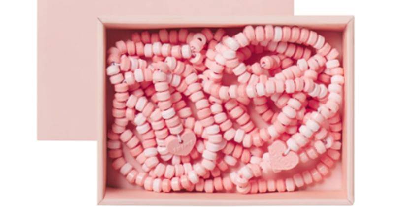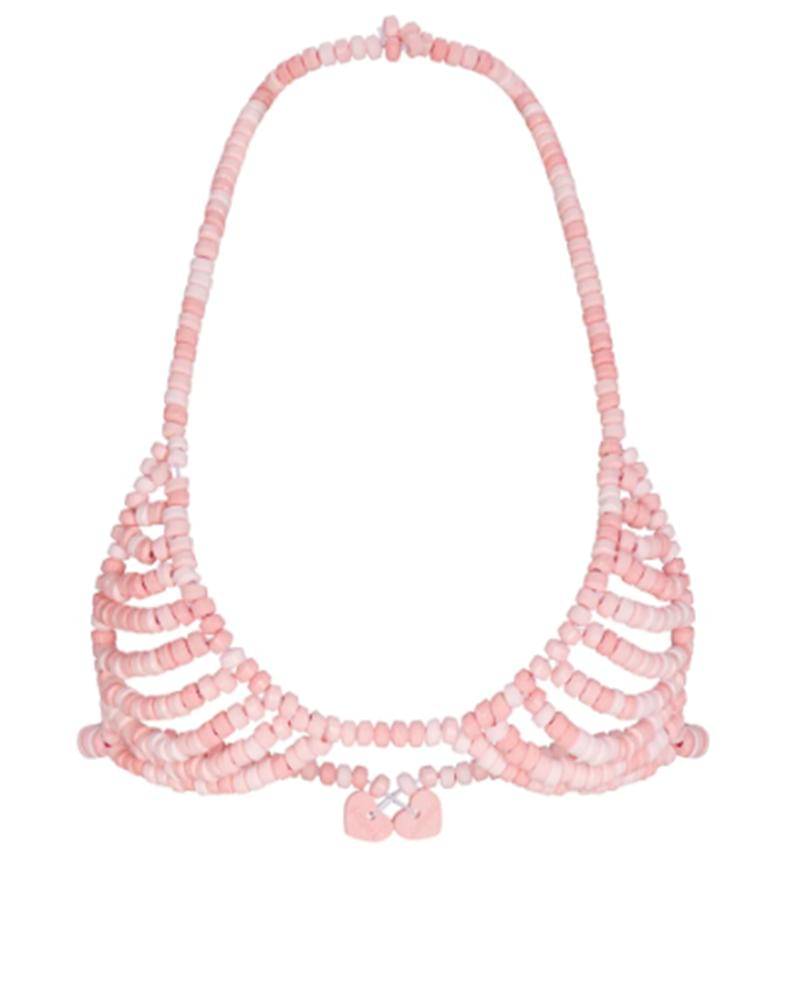 Lingerie dengan tone warna pink ini bukan terbuat dari beads biasa karena bisa dimakan. Mereka membuat lingerie dari beads permen, yang lengkap dengan nutritional facts