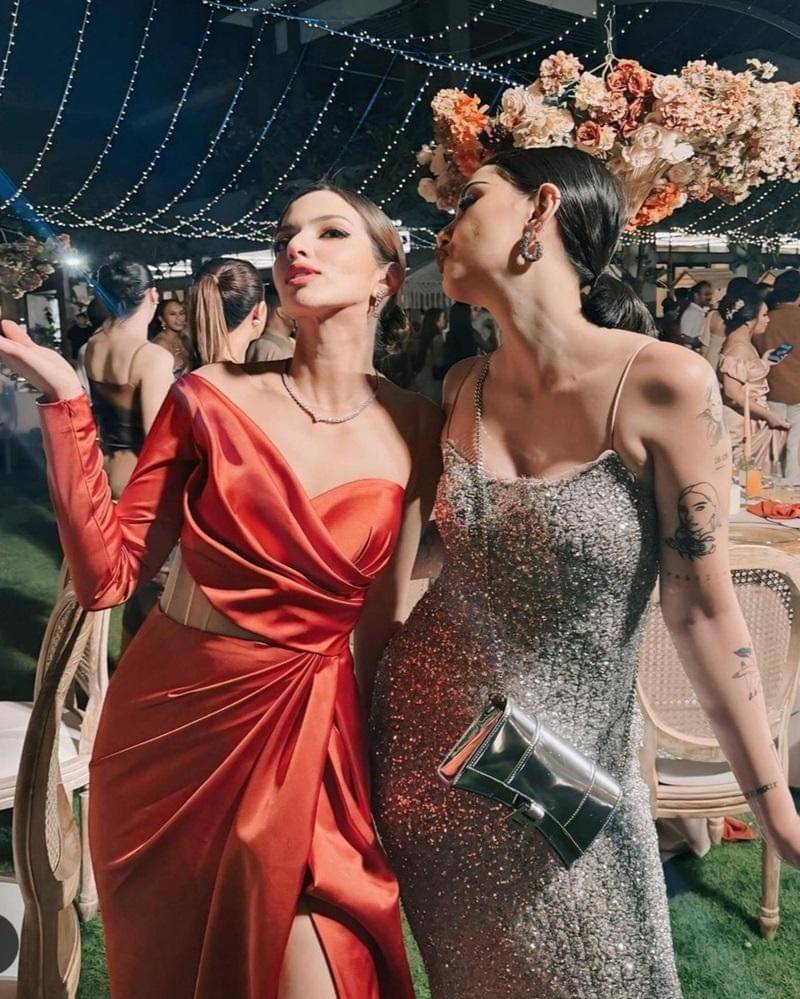 Para sahabat Mahalini memilih desain dress yang sesuai dengan lokasi. Karena berada di pulau Bali dan acara dimulai dari sore hari, maka kebanyakan dressnya adalah spaghetti strap dress.
