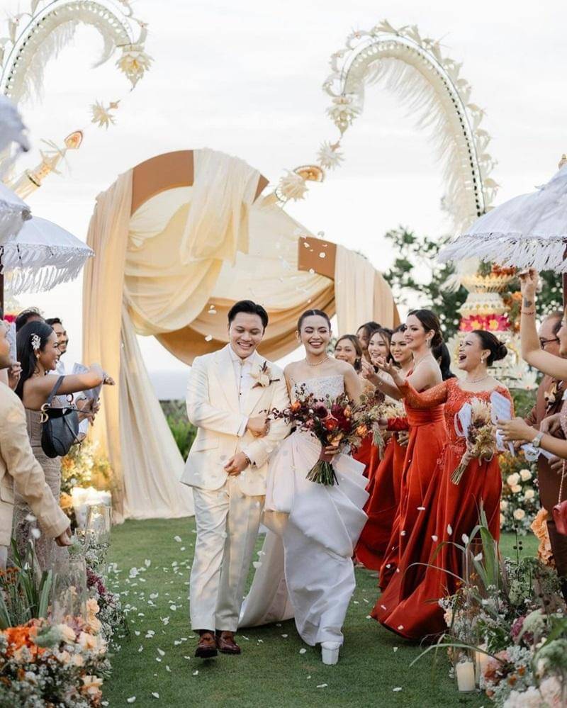 Rizky Febian dan Mahalini Raharja melanjutkan acara resepsi. Kali ini diadakan di hotel mewah di Nusa Dua, Bali.