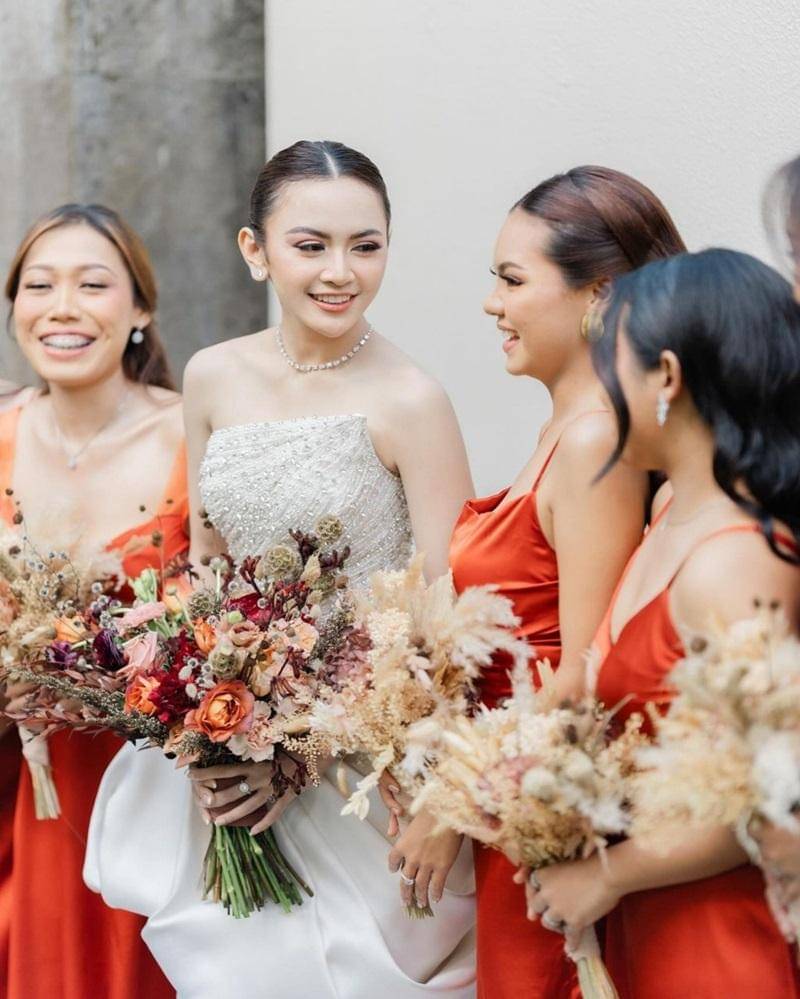 Untuk kesan yang lebih manis, semua bridesmaid Mahalini memegang buket bunga yang sama. Bunganya pun dipilih yang kekinian yaitu dried flowers.