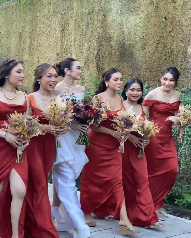 Salah satu yang jadi perhatian adalah aksen gaun para bridesmaid. Meski semuanya terlihat mengenakan gaun panjang, namun ada beberapa yang menggunakan aksen.