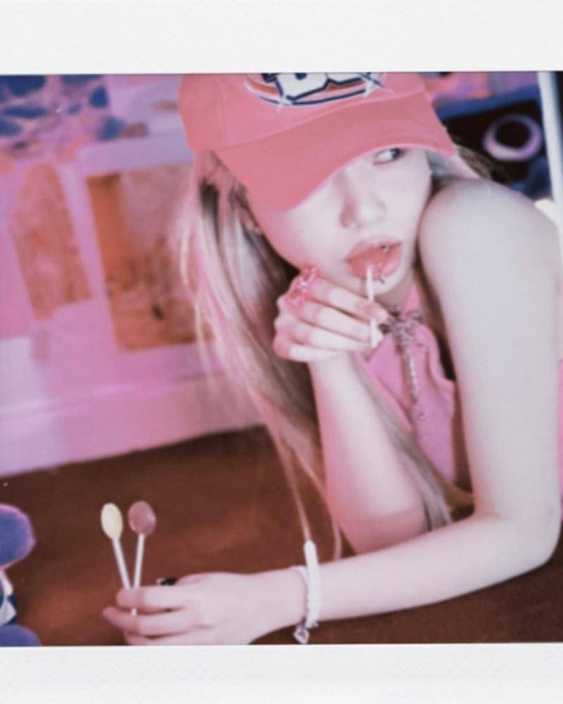 Rambutnya yang pirang ditutup dengan topi baseball berwarna pink, yang senada dengan tanktop-nya.