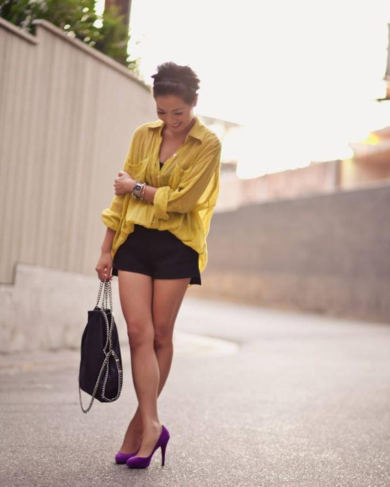 Cobalah mengenakan celana pendek berwarna putih dengan kemeja berwarna kuning. Chic!