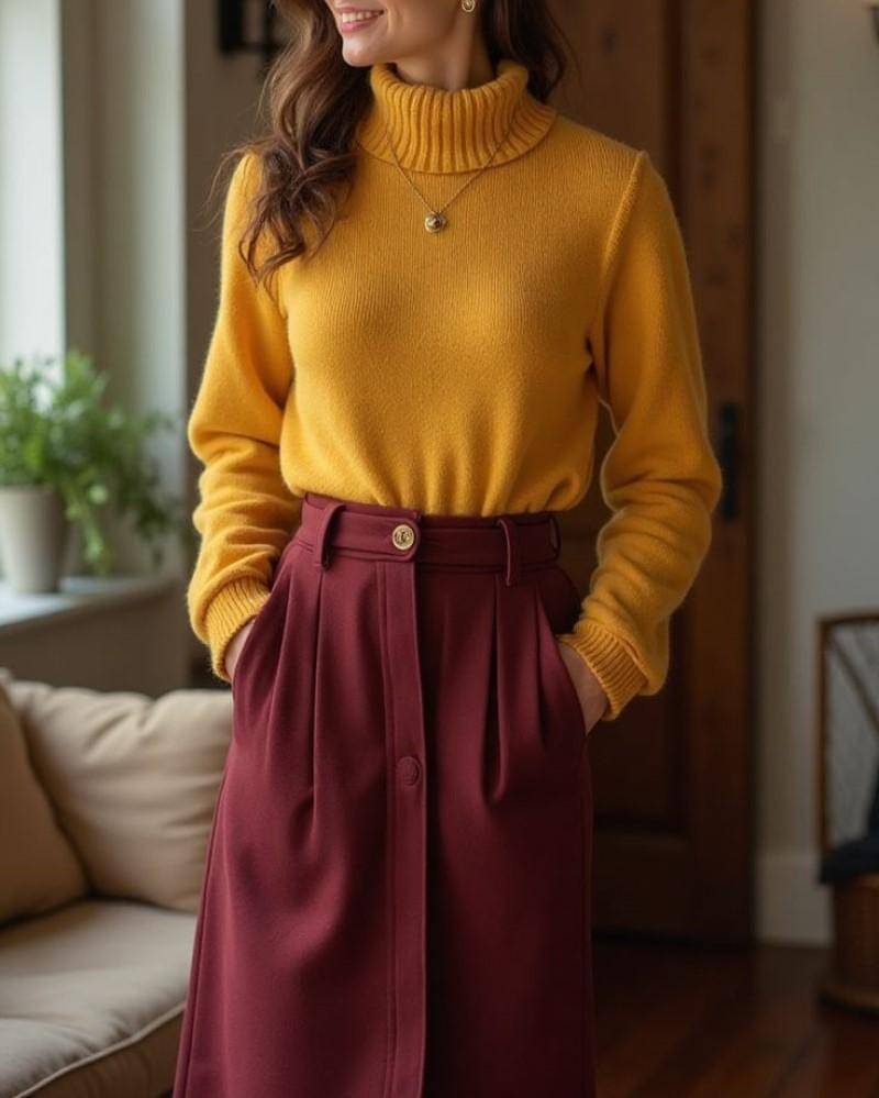 Untuk kesan yang feminin, Mama bisa memadukan sweater kuning mustard dengan celana berwarna maroon.