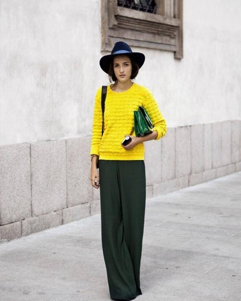 Satu lagi warna yang tak bisa terlupa adalah hitam. Atasan kuning akan terlihat elegan dengan celana berwarna hitam.