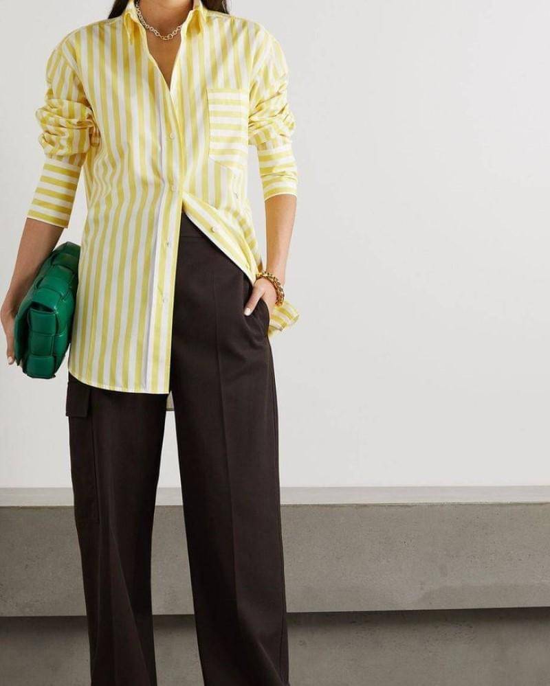 Kuning juga color coded dengan warna cokelat. Sehingga, menggabungkan celana cokelat dengan baju kuning pun masih tetap terlihat cocok. Mama bisa memilih kemeja kuning seperti ini, dan padukan dengan trousers oversized berwarna cokelat gelap. Super cool!