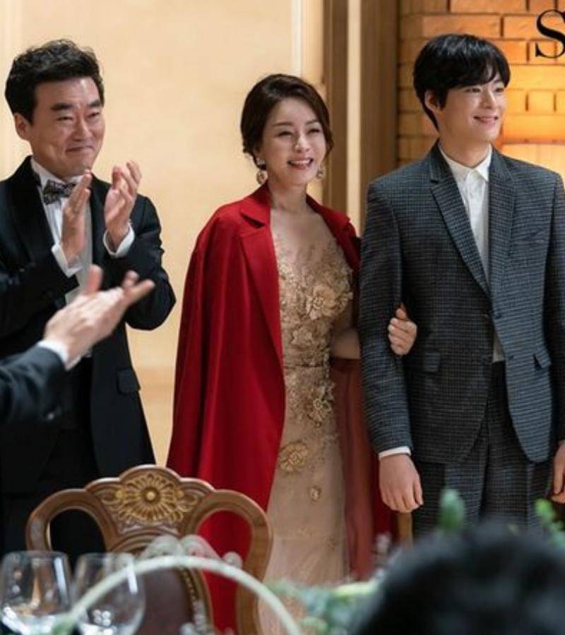 Kim Jung Nan berhasil memukau penonton dengan penampilannya yang memikat dalam balutan dress brokat berwarna emas yang megah di drama Sky Castle.