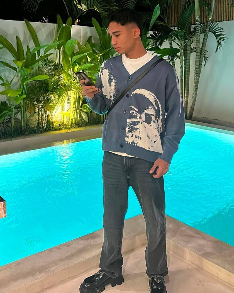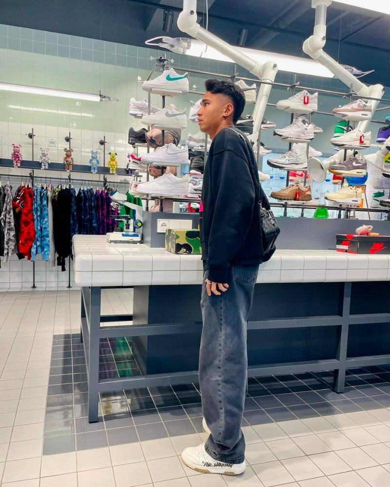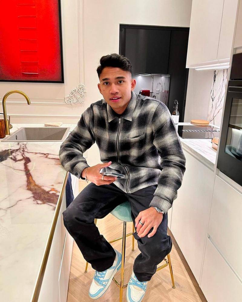 Tampilannya dilengkapi dengan jeans berwarna abu-abu gelap, lalu ditutup dengan sepatu yang gayanya tidak biasa. Ia mengenakan chunky shoes berwarna hitam, dari brand ternama dunia! Marselino juga tidak lupa membawa tas yang ia selempangkan, membuat gayanya semakin modis.