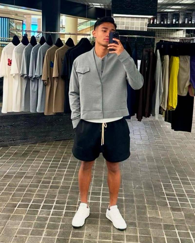 Pemilik nama julukan "Starboy" ini, memadukan atasannya dengan celana hitam berukuran pendek, dengan detail tali yang santai. Untuk menutup tampilannya, Marselino mengenakan sneakers putih bersih. Memberikan clean look yang timeless pada penampilannya kali ini.