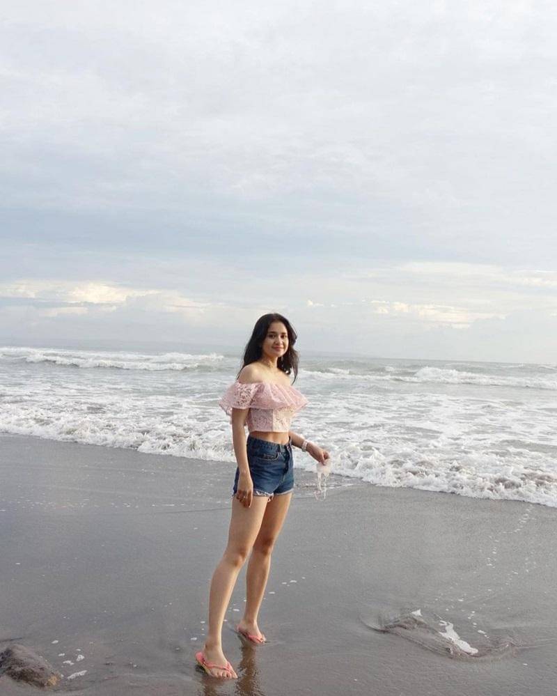 Kali ini, ia terlihat manis dengan outfit pantai yaitu short pants denim dan sabrina top warna pink muda dengan detail ruffle yang manis.