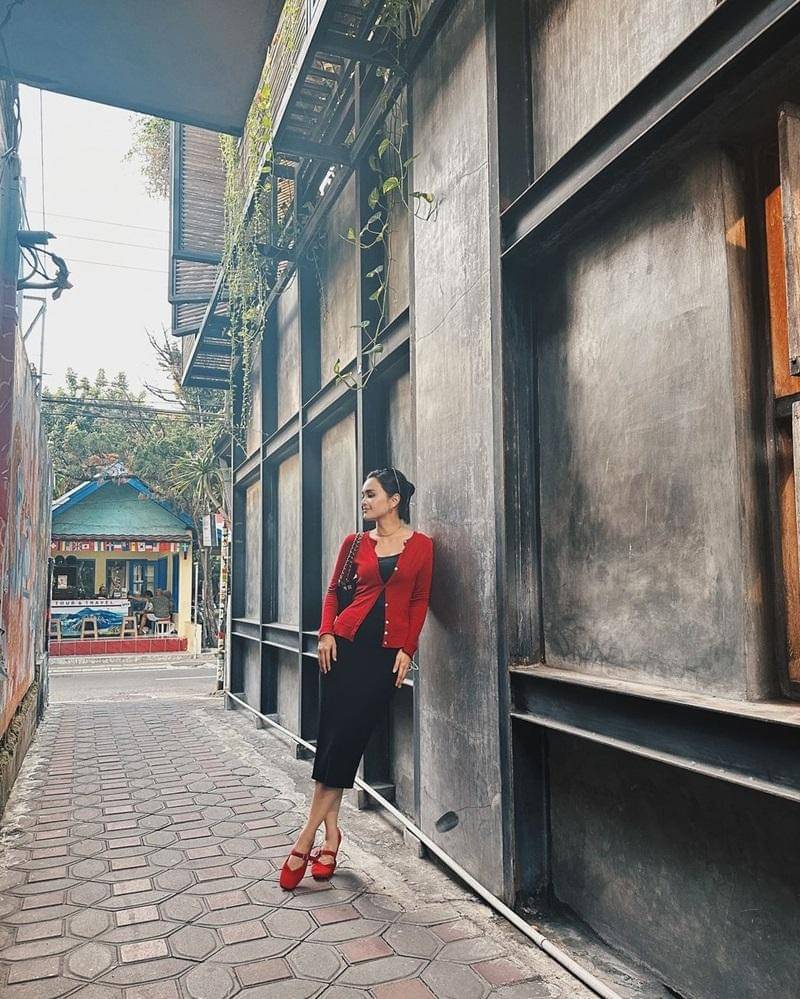Sepatu flat-nya yang berwarna merah terlihat menyempurnakan gayanya.